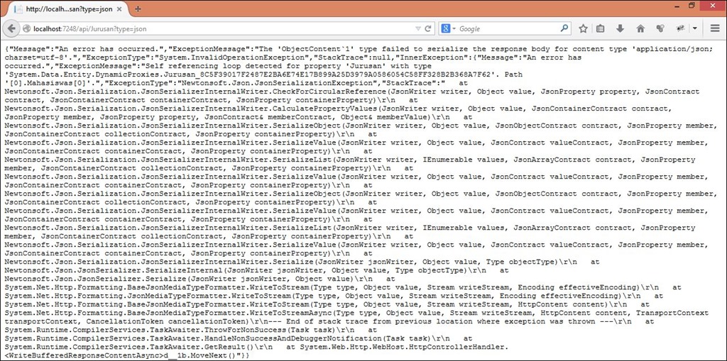 Pada bari ke-18 dapat dilihat relasi class model ini berlasi dengan class model Mahasiswa. Nah solusinya cukup tambahkan atribut [JsonIgnore] diatas baris tersebut. Sayangnya solusi ini hanya berlakuk jika format outputnya adalah JSON.