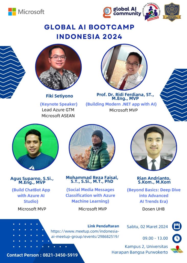 Pada tanggal 2 Maret 2024 diadakan Global AI Bootcamp Indonesia 2024 secara hybrid (online dan offline). Pembicara pada acara ini adalah: