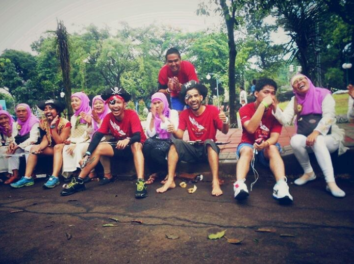 Cuek saja, masih berlari. Sejak KM-5 ini mulai terlihat hal-hal janggal yang belum pernah ditemui saat event lari yang pernah diikuti. Yaitu para “tukang kasih semangat” yang unik. Di sisi jalan ditemui para “tukang kasih semangat” memakai kaos hitam bertuliskan #BajakJKT yang memakai “sarung tangan besar” sebesar gaban (bukan sebesar gorgom). Masih biasa? Belum pernah melihat dikasih semangat oleh ibu-ibu pengajian kan? Hanya di sini, di #BajakJKT ![]()