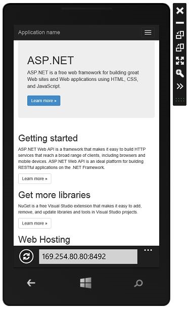 Nah misalnya ingin diakses web dari project ContohWebAPI yang beralamat di http://localhost:8492 maka bisa ditulis alamat tersebut pada emulator. Dan sayangnya hal tersebut tidak mendapatkan response dari IIS Express tersebut. Tapi seperti yang telah disebutkan di atas semestinya digunakan IP Address, maka alamat yang mesti digunakan adalah http://169.254.80.80:8492. Akan tetapi dengan mengetikkan alamat tersebut pada emulator tidak mendapatkan response dari IIS Express.
