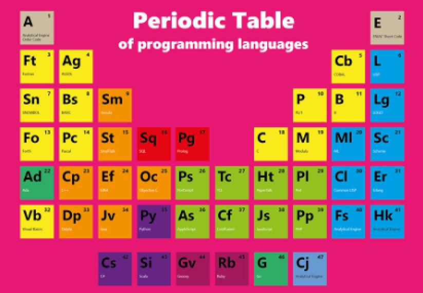 Kemudian gambar berikut mengelompokkan bahasa pemrograman dalam tabel periodik.