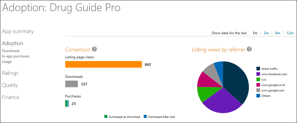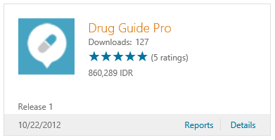 Sebut saja 1 aplikasi itu adalah Drug Guide Pro hasil dari salah satu developer hebat Adib Toriq (yang tentu saja dari Indonesia), aplikasi database obat-obatan ini sudah ada di Windows Store sejak tanggal 22 Oktober 2012, sebelum Windows 8 hadir untuk public di tanggal 26 Oktober 2012. Dari statistik yang didapat di Dashboard Windows Store maka di dapat data kurang lebih 100 download, masih belum banyak memang.