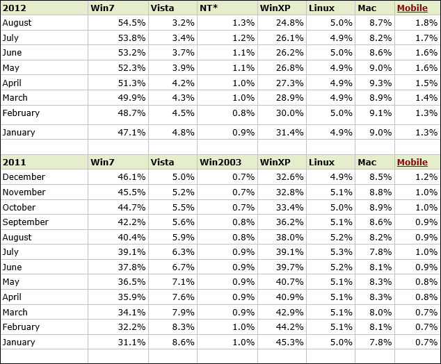 Pengguna Windows 7 makin menaik, dan pengguna Vista dan XP makin menurun. Jangan pikirkan pengguna Vista dan XP akan beralih ke OSX atau Linux, terlalu kecil prosentasi mereka ke sistem operasi itu