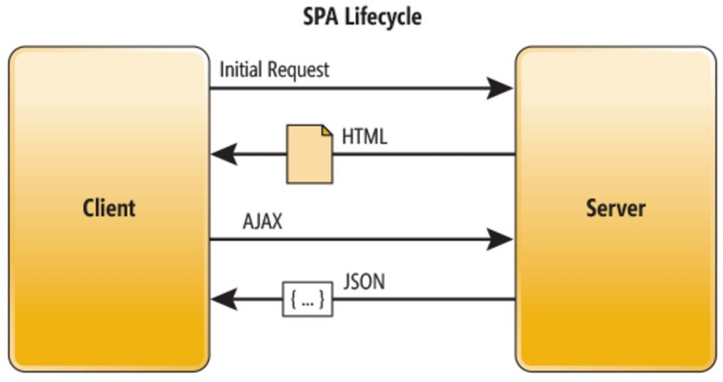 Sedangkan Single Page Applications (SPAs) memiliki cara kerja seperti gambar di bawah ini. Proses pertama sama seperti pada gambar di atas. Tetapi setelah itu tidak akan ada lagi response dari server berupa halaman HTML, tetapi komunikasi hanya akan dilakukan dengan AJAX dan response berupa data dengan format JSON.