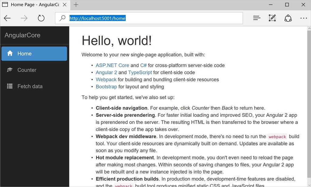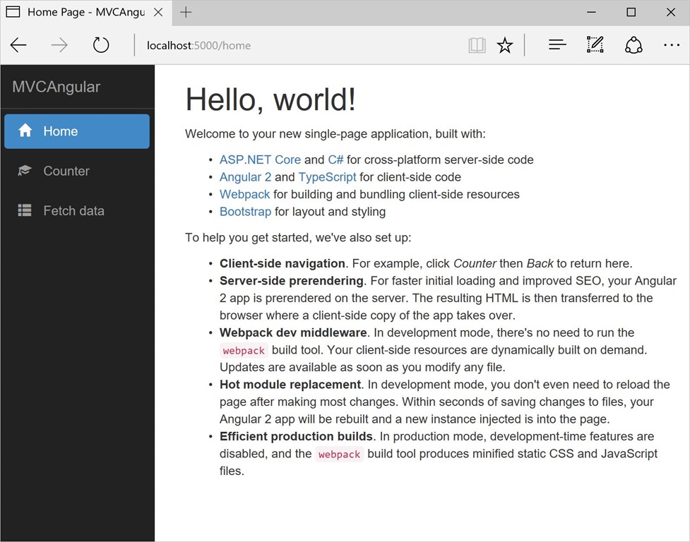 Kembali ke pertanyaan di atas tentang bedanya SPAs dan aplikasi web multi page (MPAs) dengan AJAX. Mari kita lihat cara kerja aplikasi AngularCore yang telah kita buat di atas. Setelah aplikasi web dari project AngularCore, maka pertama kali akan dilihat tampilan web seperti berikut ini.