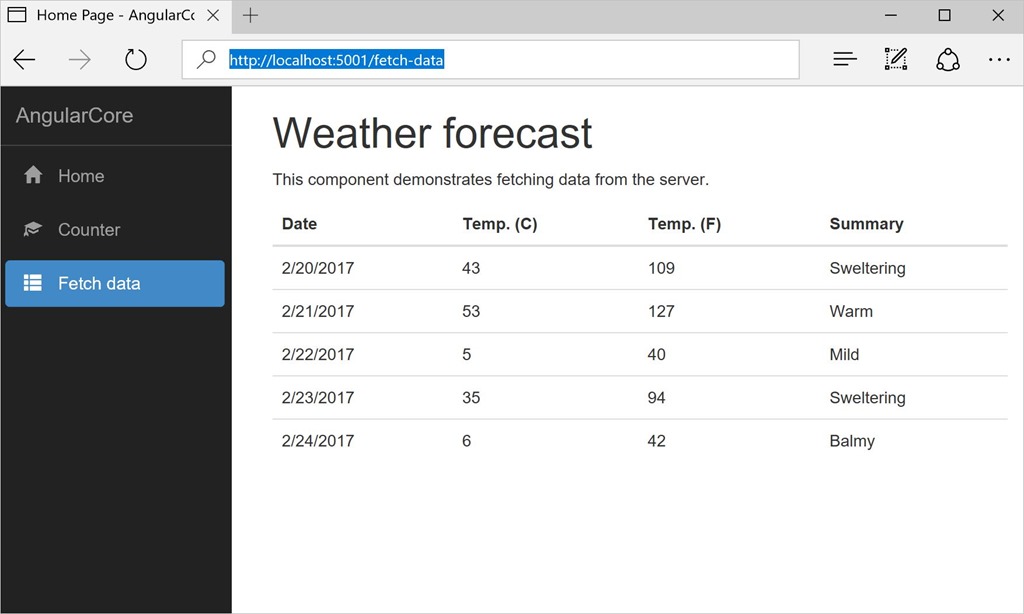 Pada halaman di atas dapat dilihat alamat http://localhost:5001/counter. Kemudian ketika menu Fetch data diklik makan akan dapat dilihat halaman berikut.